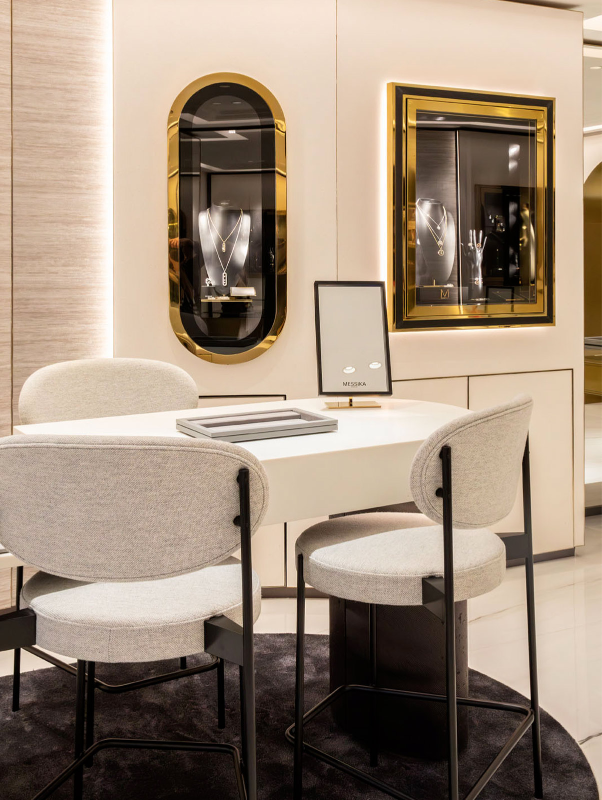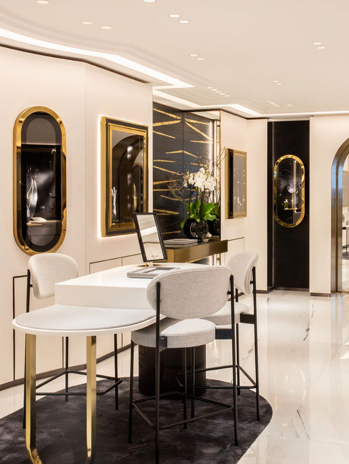 في مزيج من الكلاسيكية والعصرية، يتميز المتجر بمجموعة من المواد الفاخرة، كالرخام الأبيض والزجاج، كما تضفي اللمسات الذهبية والسوداء توازنًا خاصًا.