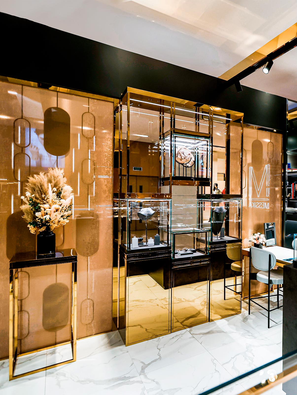 يبرز تألق الماس الدائم بلمسة من الحداثة المتجسّدة في التصميم العصري المصنوع بأكمله من الرخام الأسود بالإضافة إلى حواف خطوط ذهبية وتفاصيل حظيت بعناية فائقة حيث عُرضت كل المجموعات المرموقة من مجوهرات الماس: مثل Move وGlam’Azone وMy Twin وLucky Move.