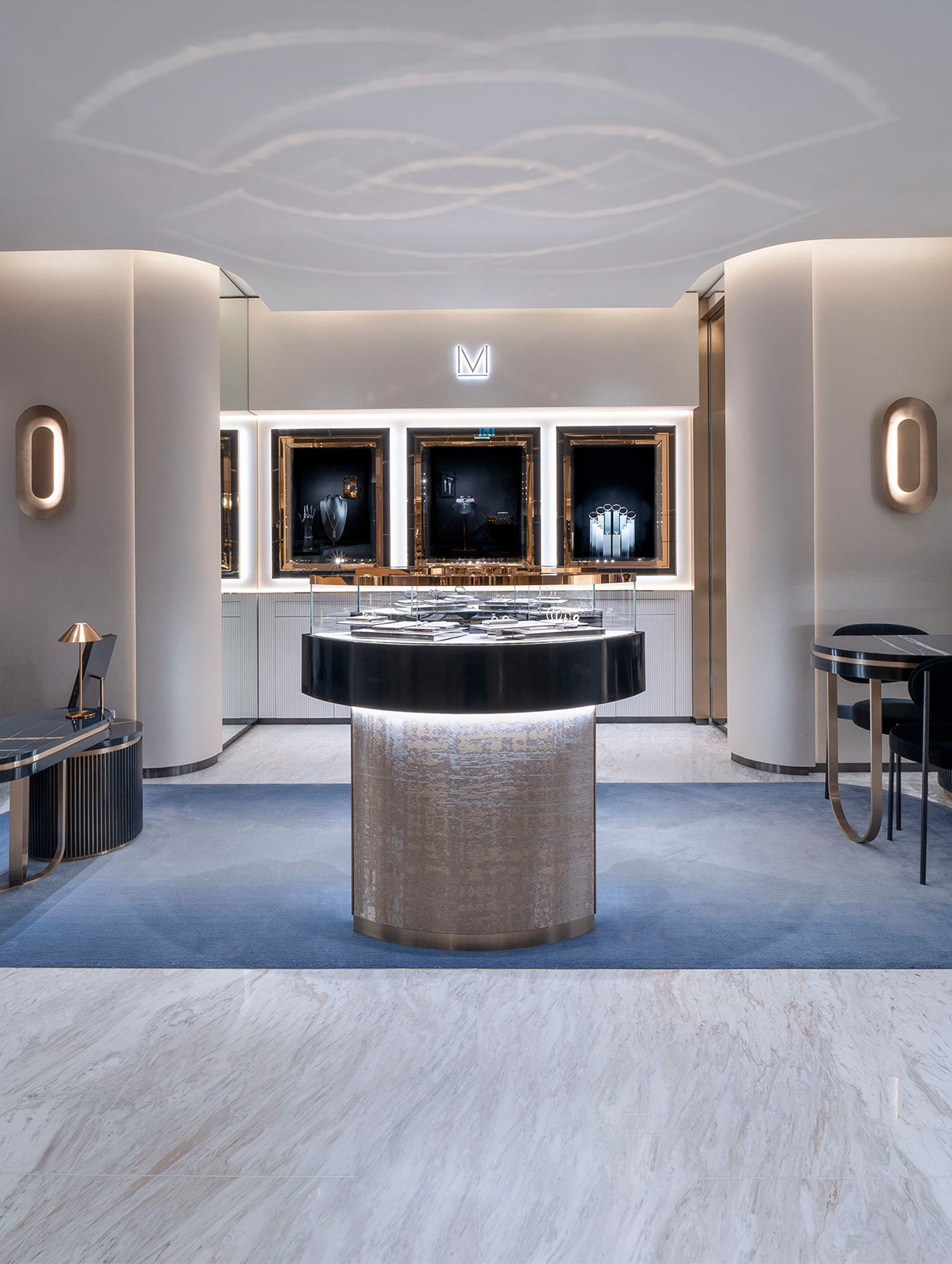 يستقبل المتجر زوّاره بواجهات عرض مُخصّصة لعرض مجموعات مجوهرات ميسيكا ومجوهراتها الراقية، ويدعوهم إلى استكشاف جماليات العلامة الفريدة وتصاميمها المبتكرة عن كثب. ومن أبرز ما يلفت النظر داخل المتجر منصة Move الأولى والفريدة من نوعها في آسيا، والمخصّصة لهذه المجموعة الشهيرة من تصميم العلامة. حرصًا على تقديم تجربة ضيافة مميّزة لعملائنا المهمين، يضم المتجر ركن جلوس مريح يزدان بأثاث يحمل بصمة العلامة، من بينها ورق جدران مصنوع يدويًا ببراعة وسجاد Move الأزرق المتدرّج المصمّم خصّيصًا.