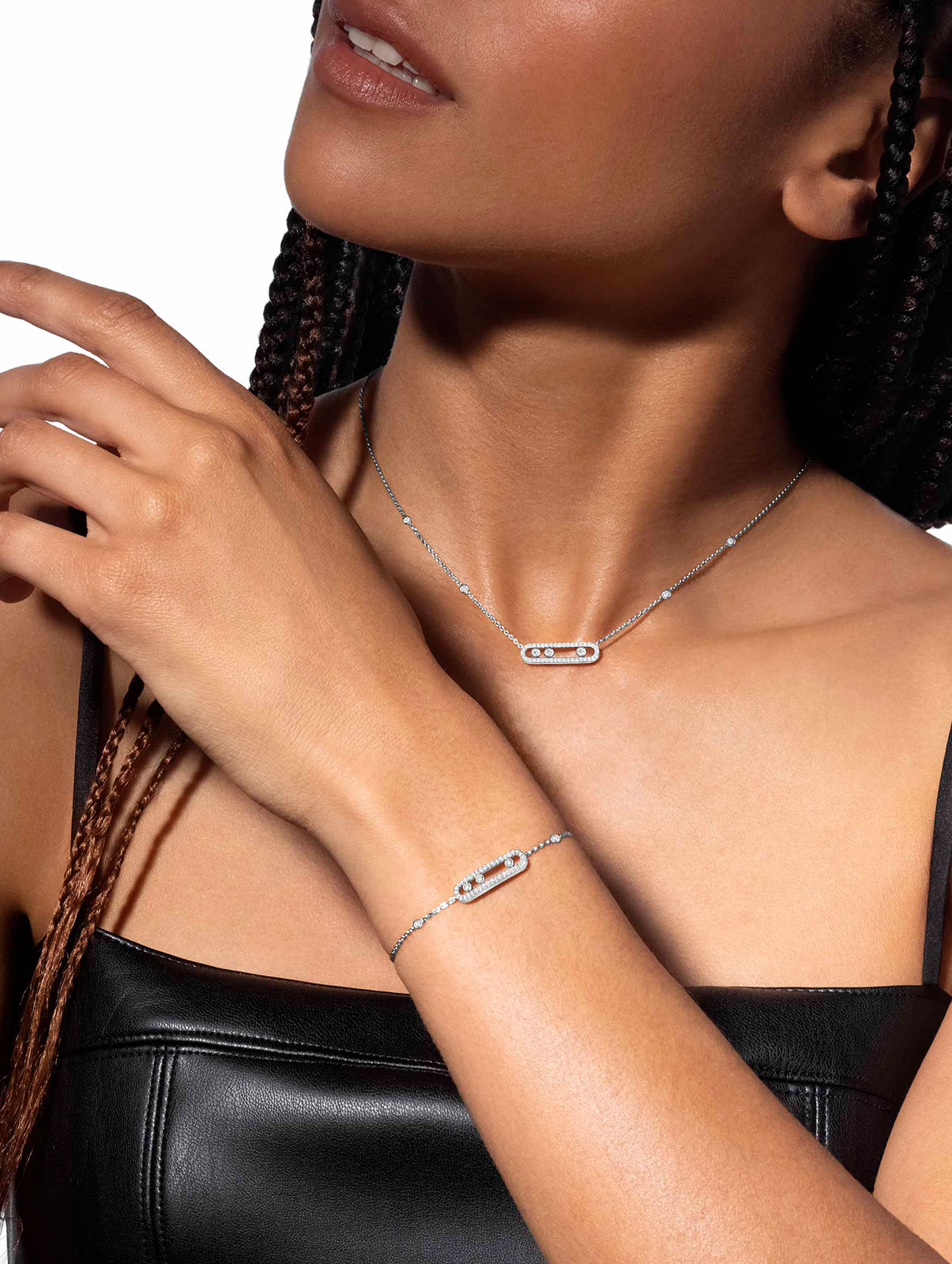 能否叠戴不同色彩的金质钻石手镯/手链,同时呈现和谐悦目的美感?当然可以!适合自己的,就是理想搭配!叠戴白金、黄金和玫瑰金手镯/手链,令您的造型加倍闪亮耀目。这种搭配融合奢美色彩,不同金质与活动钻石为您的日常注入迷人的优雅气息。当Skinny玫瑰金钻石手链与Move Noa白金钻石手镯闪耀搭配,魅力无法抵挡!