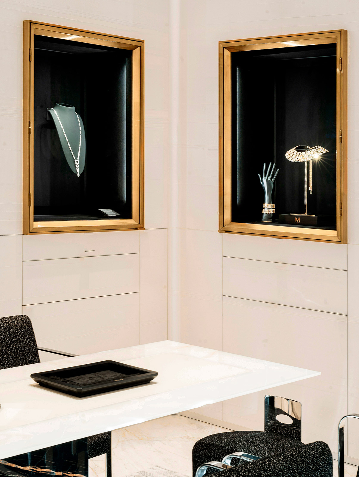 Designed to reflect the essence of the brand, its luxurious contemporary décor features glowing gold, fine marble and white onyx. In a gently pearlescent purple ombré, the textured wallpaper was developed exclusively for the boutique by the artist Martin Berger’s atelier. The experience is elevated by a stunning ceiling light comprised of gold-plated and clear crystal waves, a suspended waterfall echoing the radiance of the Maison’s diamond jewelry.