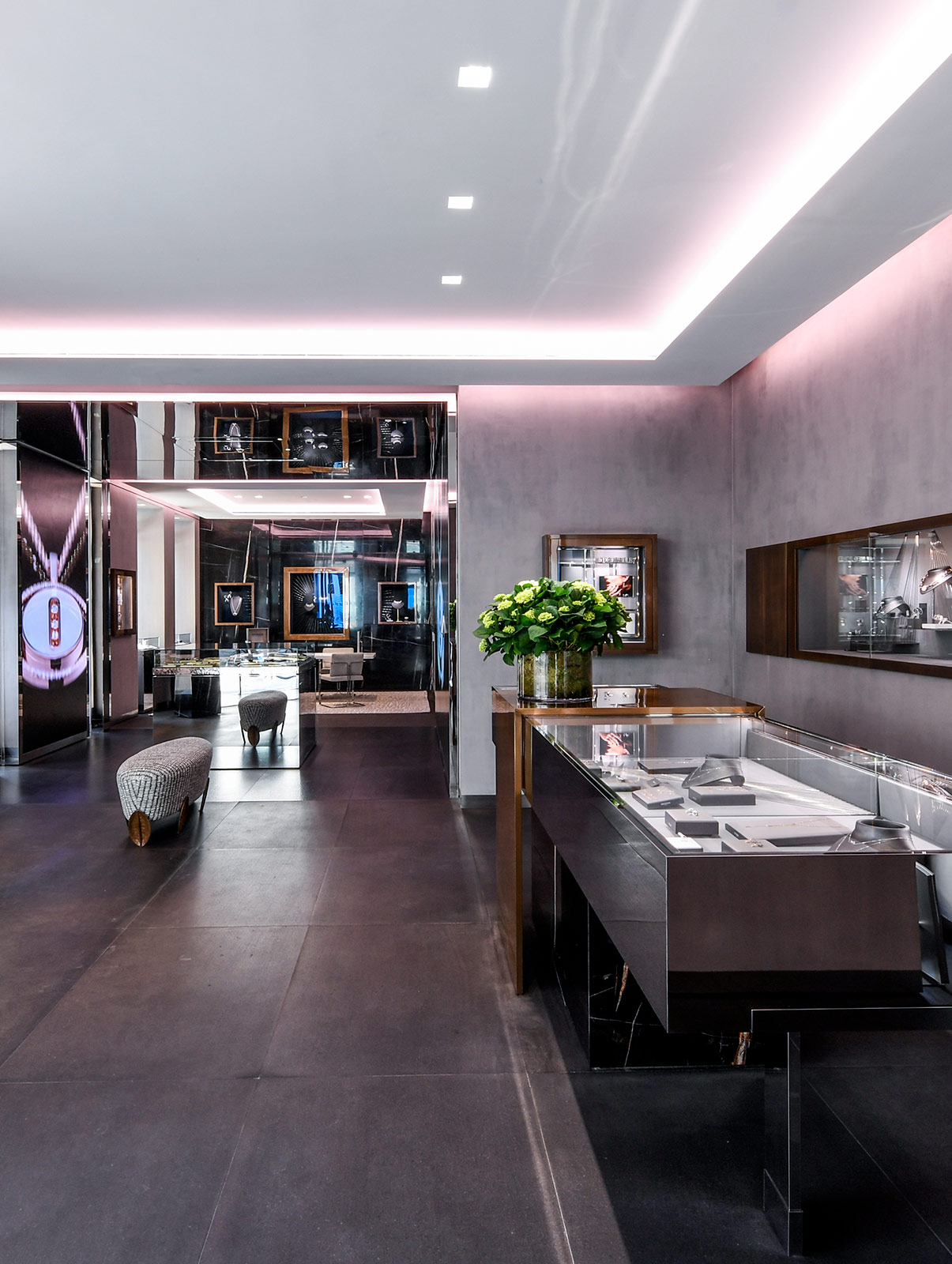 Upon entering, the customer is immediately immersed in a refined environment with luxurious materials, reflecting the common values of both Maisons. With the symmetry of the design, the transparency of the windows, marble flooring and black and white details, the two Maisons showcase Messika diamond jewelry and invite you to discover it in a magical environment.