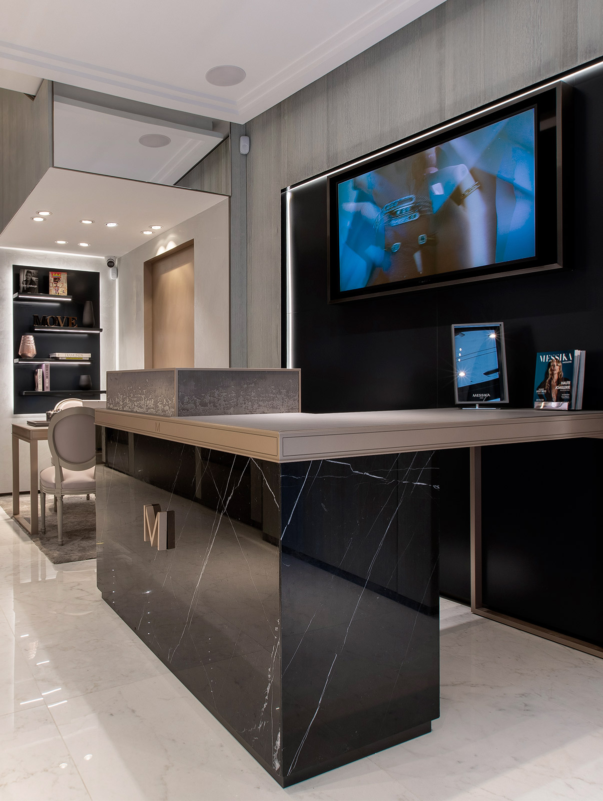 As soon as they enter, the customer is immersed in the brand’s world: symmetry of design, transparency of the windows and black marble to highlight the brilliance of the diamonds... The designer has created a magical environment to illuminate her Jewelry and High Jewelry collections.