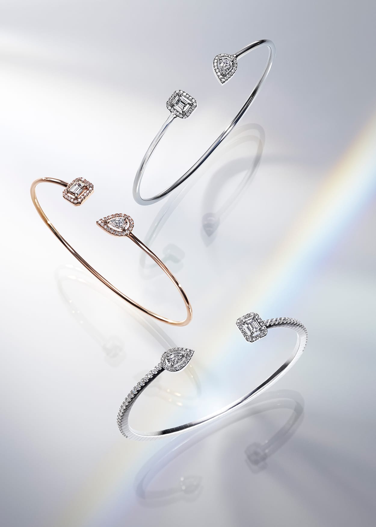 In a modernized version of the timeless Toi & Moi, Valérie Messika suggests a new way of sealing one’s love, via the unexpected marriage of two different cuts of diamonds. The sensual and sparkling diamond pear shape echoes the stylized and hypnotic diamond emerald cut. Between opposition and twinship, the stones call out to one another, and complement each other in a resplendent ‘pas de deux’ without actually touching. The stones unveil their radiance in turn with each movement.