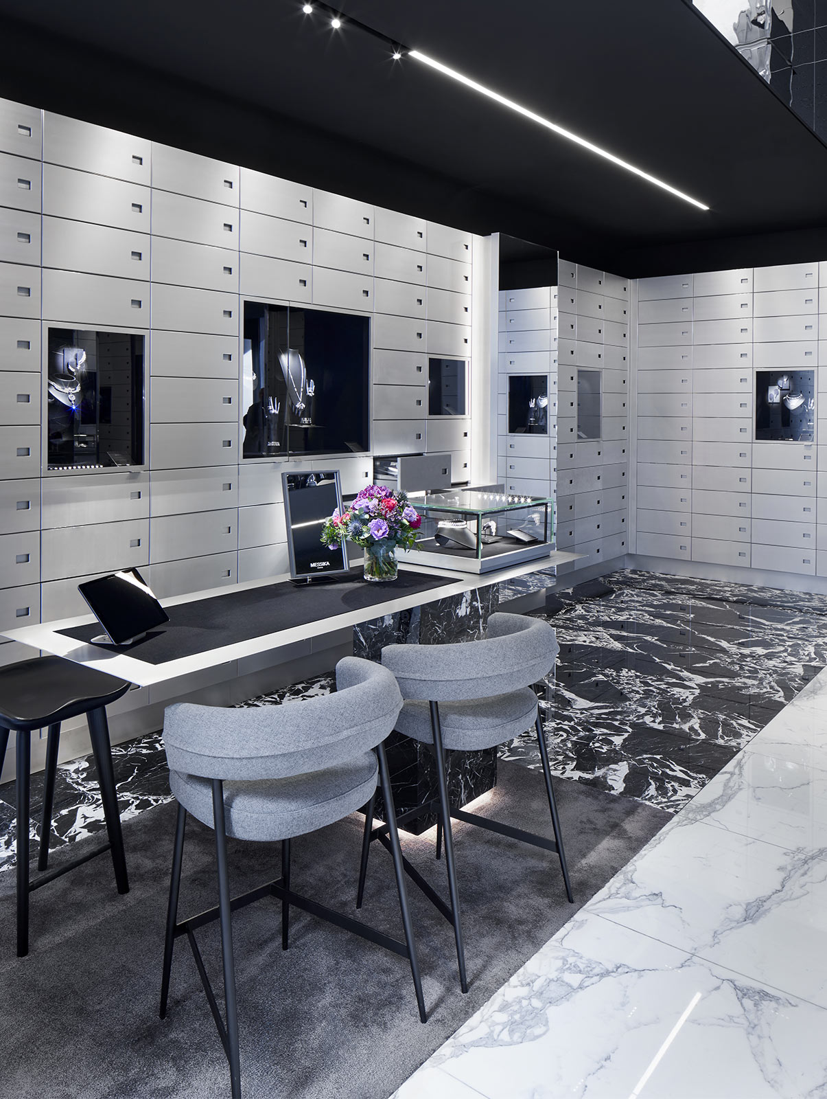 Accompagné du bureau Betak pour son expertise mode et image reconnue, ils optent ensemble pour un positionnement inédit, bien différent des traditions de la place Vendôme. Valérie Messika imagine une boutique inspirée d’un coffre-fort.