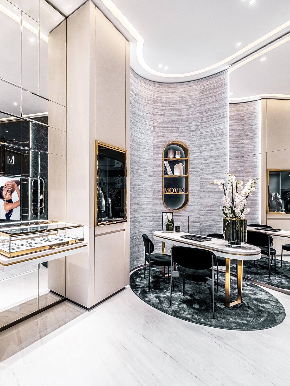 Marbre noir, nuance d’or, de gris et de beiges, salon élégant et cosy, tous les codes de la Maison sont à retrouver au sein de ce précieux espace de plus de 50m2. Une pause luxueuse entre or et diamants pour apprécier tout l’éclat des bijoux diamant. L’expérience est prolongée par un espace VIP, dans une alcôve aux douces couleurs bleutées qui offre un parfait cocon d’intimité grâce à ses panneaux pivotants. Cette boutique est un véritable écrin exclusif respirant l’art de vivre à la française si cher à Valérie Messika.