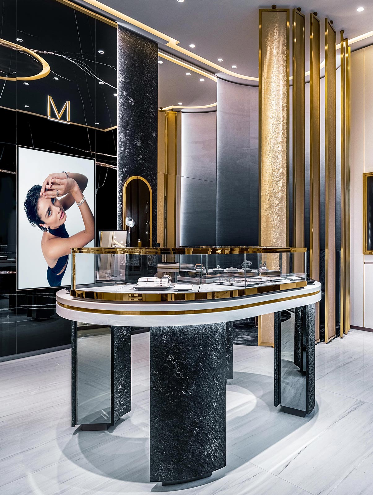 Mármol negro, tonos dorados, grises y beiges, salón elegante y acogedor, todos los códigos de la Maison se congregan en este precioso espacio de más de 50 m2. Una suntuosa pausa entre el oro y los diamantes para apreciar todo el resplandor de las joyas de diamantes. La experiencia se amplía con un espacio VIP, en una alcoba de suaves colores azulados que ofrece un perfecto rincón íntimo gracias a sus paneles pivotantes. Esta boutique es un auténtico establecimiento exclusivo que respira el arte de vivir francés tan apreciado por Valérie Messika.