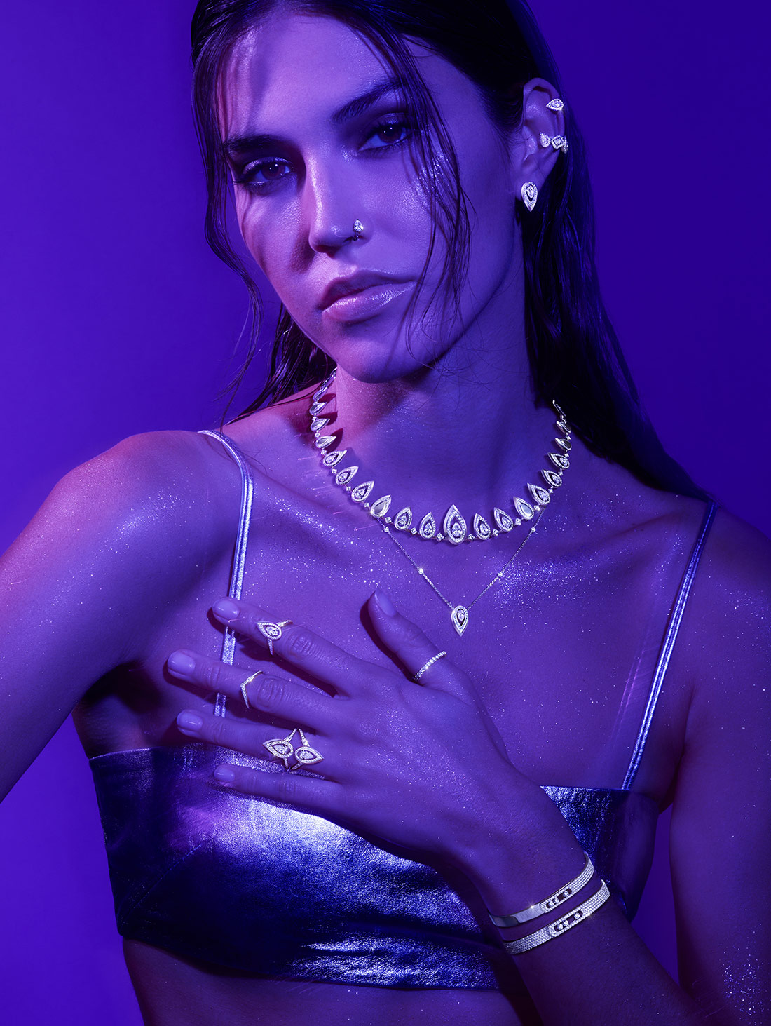 La Directrice Artistique mixe à la perfection ses inspirations et son savoir-faire. Pureté des lignes, puissance des portées, diamants d’exception, elle réalise ici une symphonie rétro-futuriste subtilement teintée d’ Égypte. Des parures uniques et innovantes où les diamants se métamorphosent de pièces en pièces. Des bijoux vibrants et hypnotiques. TEST1