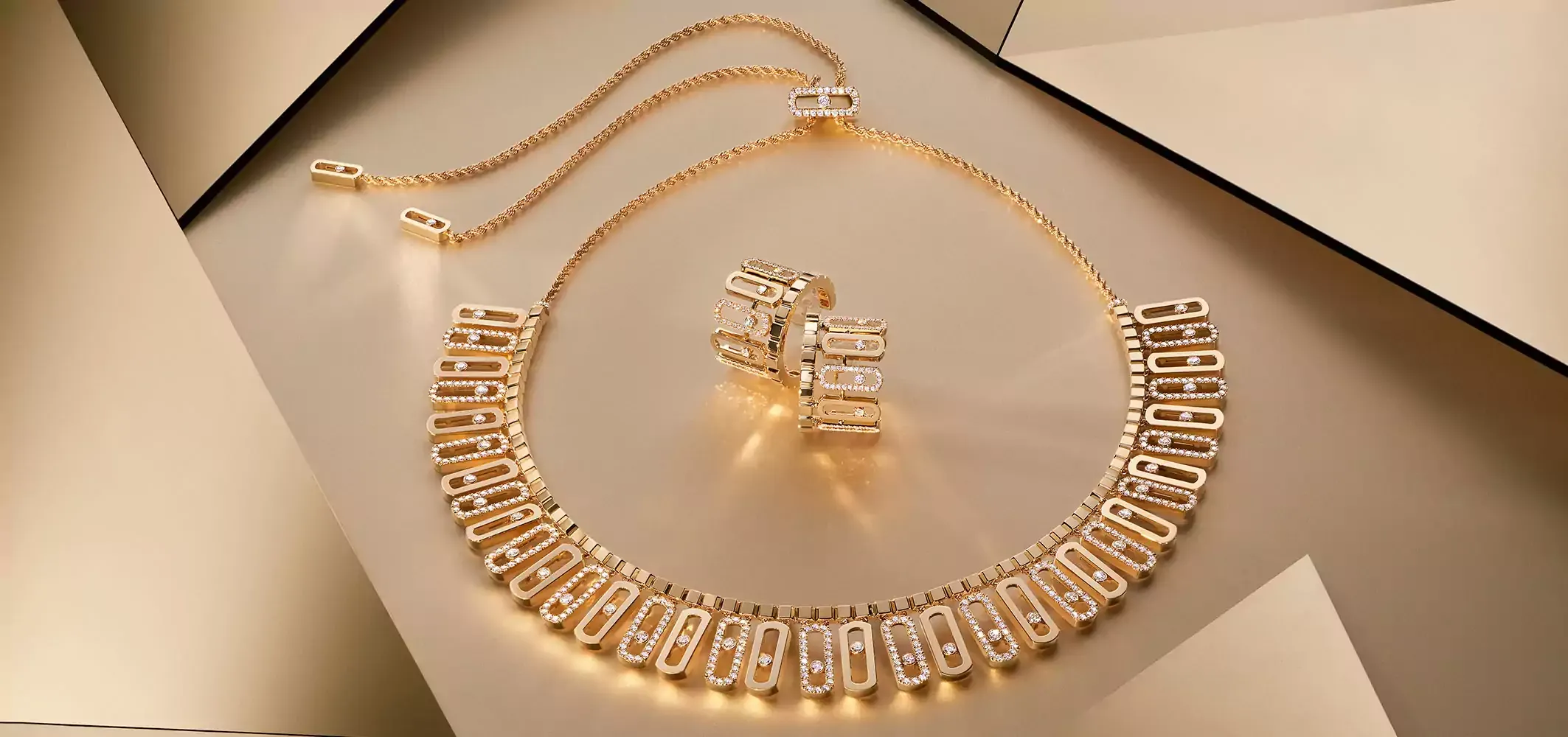 La Maison Messika créé pour ce set un design décalé en jouant sur les plans et les contrastes de couleur. L’or révèle ici tout son éclat dans un jeu de facettes crées par un effet poli-miroir qui résonne parfaitement avec les diamants.
