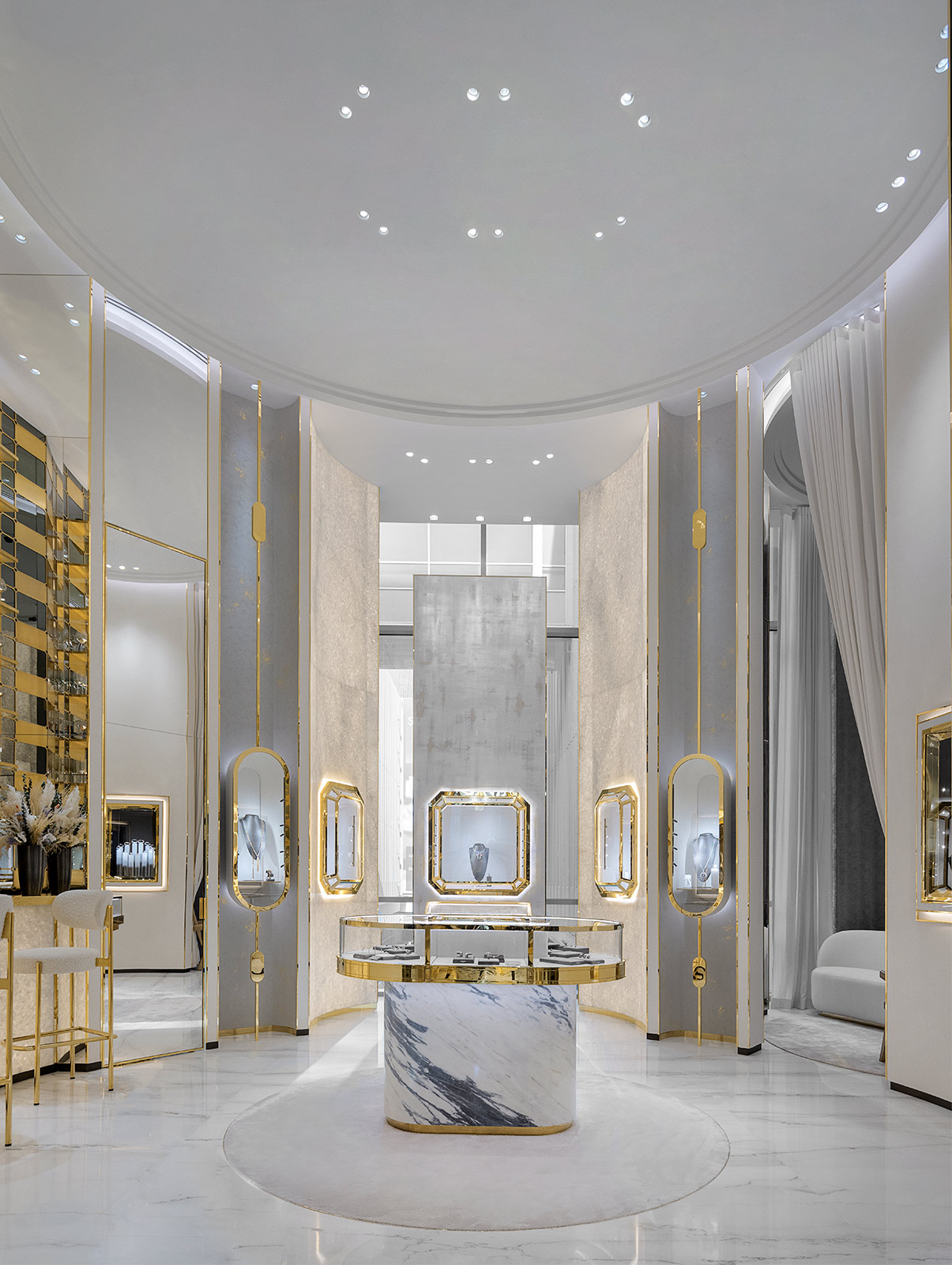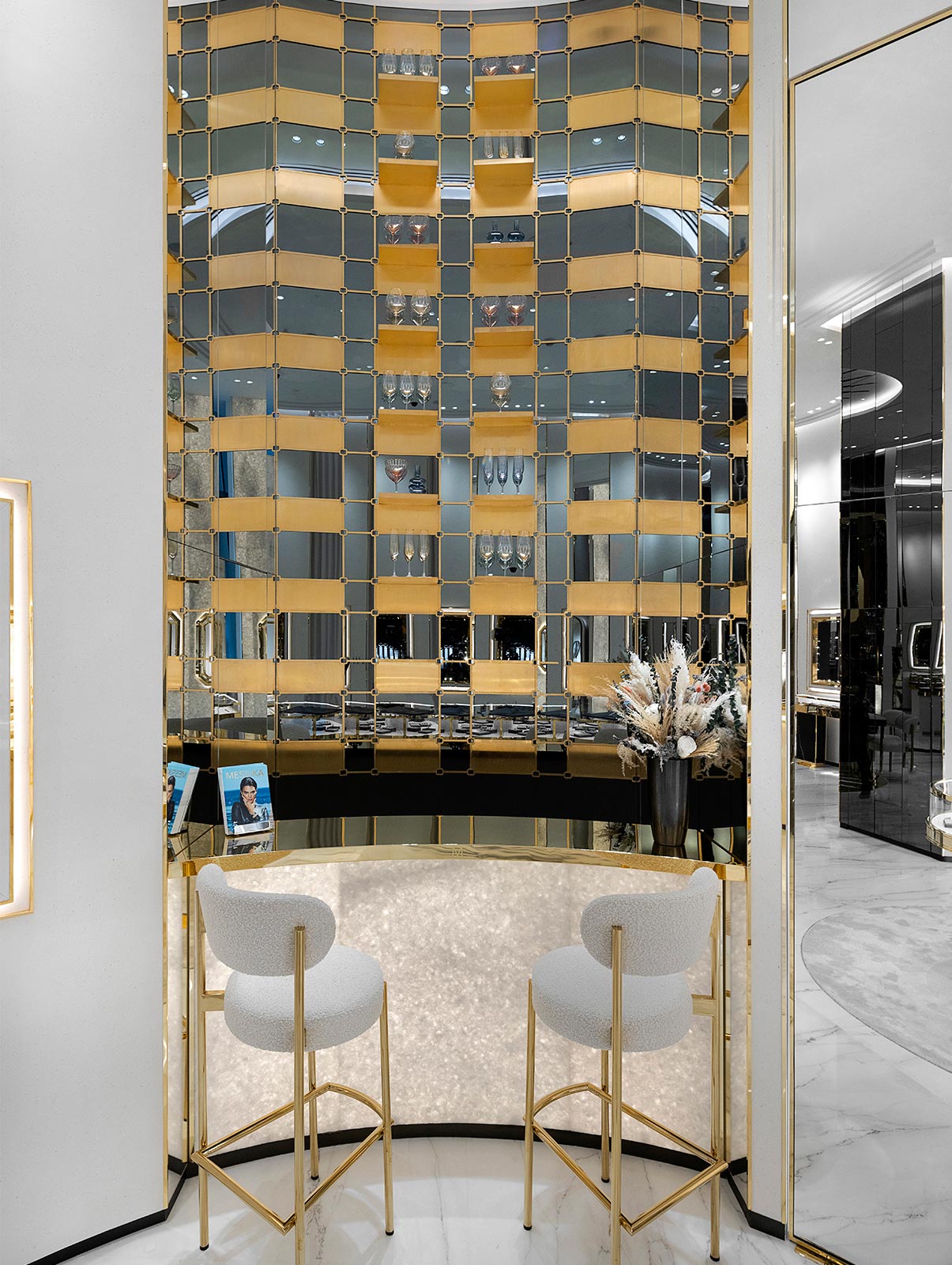 メゾン メシカの価値観を体現する新ブティックを手がけたのは、メゾンのアーティスティック ディレクターであるヴァレリー・メシカ。モダンな雰囲気に満ちた空間は、高さのある壮麗な天井やグラフィカルなラインといったミニマルな美意識によって現代的なオーラと独創性を放ちます。ホワイトマーブルやアラバスター、ゴールドに輝くメタリックなディテール、斜めにカットされたミラーなどを組み合わせた内装は、宝飾技術の伝統的なルールに挑み続けることで、妥協を許さないサヴォワールフェールとともにタイムレスなラグジュアリーの本質を再解釈する、というメシカの想いを表現しています。