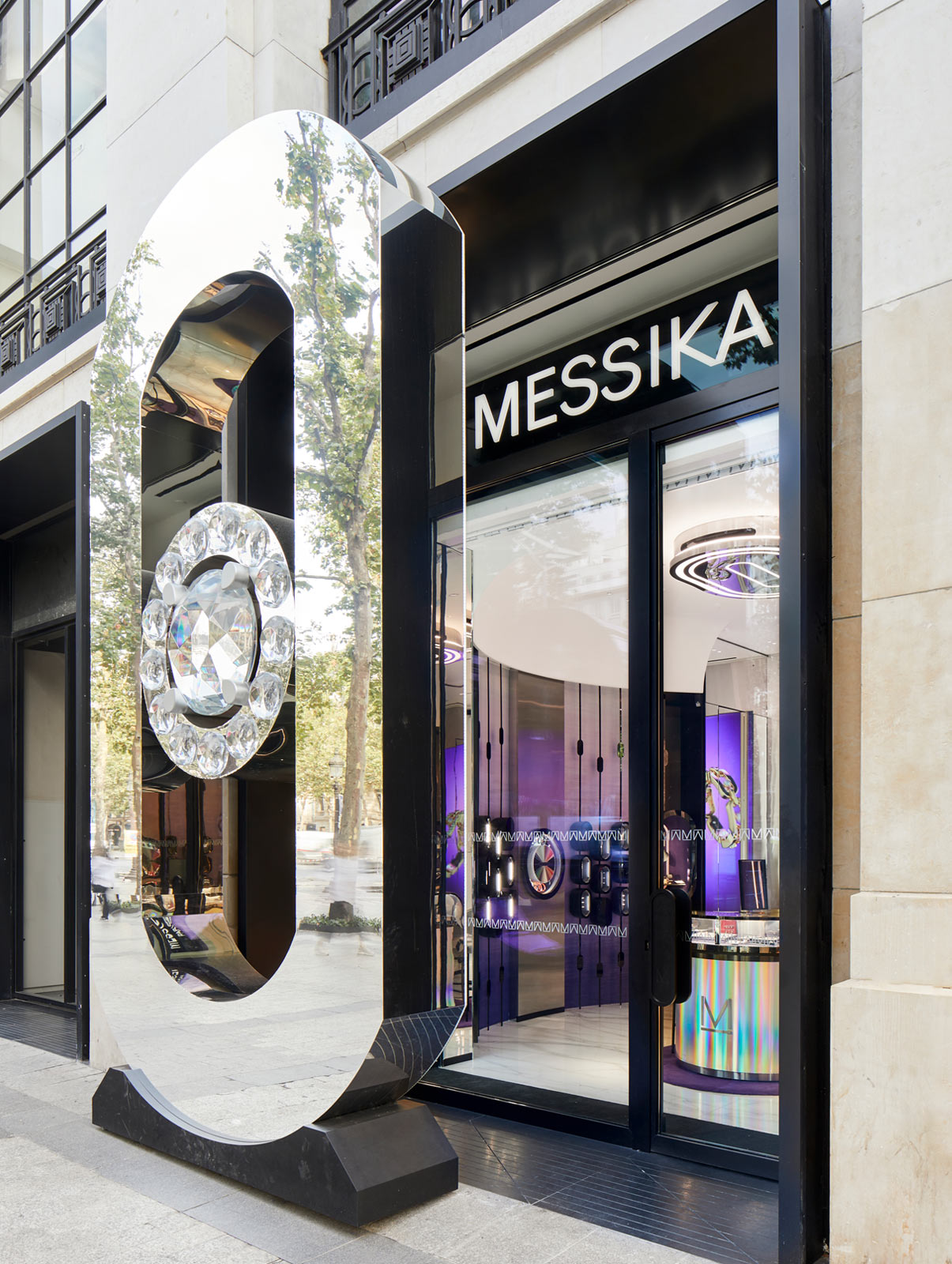 シャンゼリゼ通り52番地は、すでにメシカの象徴的な住所となっています。 この新しいショーケースは、メシカのトレンドを反映したパワフルなオーラで輝き、角度によって異なる色彩を放つ、遊び心にあふれた現代的な雰囲気に包まれています。《ムーヴ》ダイヤモンドジュエリーに捧げられた没入型のスペースでは、ユニークなジュエリー体験がお楽しみいただけます。 現代の「貴婦人の私室」のようにデザインされたコンセプトストアには、メゾンを成功に導いた象徴的な作品を発見し、再発見していただけるよう、《ムーヴ ウノ》、《マイ ムーヴ》、《ソー ムーヴ》、さらに《ラッキー ムーヴ》が展示されています。 ファサードにもアーチにも、大胆なデザインやXXLサイズの《ムーヴ》ジュエリーがいたるところで輝き、店内全体に展開します。ショーケースは象徴的なラインを描き、独創的な入れ子構造でメゾンのダイヤモンドジュエリーの美しさを引き立てます。上からは《ムーヴ》の円形装飾が空間全体を照らし、中央のスペースとの調和を生み出します。
