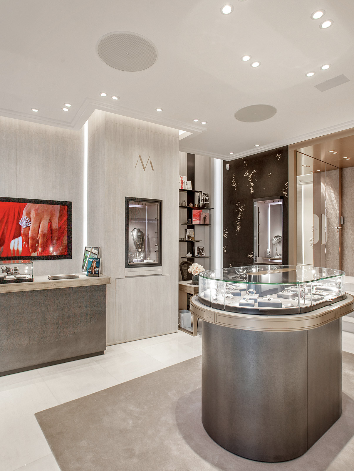 一歩足を踏み入れれば、そこにはブランドの世界観で満たされた空間が広がります。シンメトリーなデザイン、透明感あふれるウィンドウ、大理石の床、ブラックで統一されたディテールなど、ヴァレリー・メシカが、自身のダイヤモンド ジュエリー コレクションのために魅惑の空間をつくり上げました。