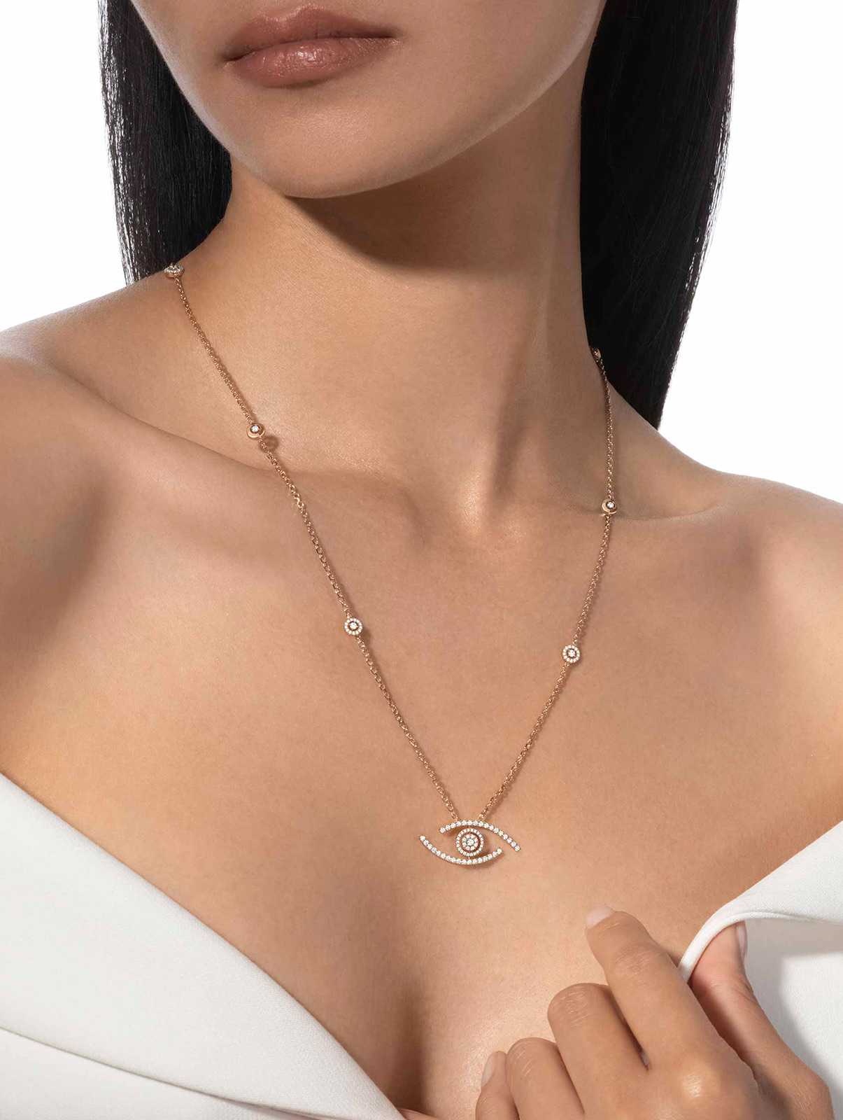 《ラッキー アイ》ピンクゴールド&ダイヤモンド ロングネックレスも魅力的。シャツの上にも、デコルテにも着けることができます。ロングチェーンのネックレスに結ばれたラッキーチャームは、精巧にあしらわれたパヴェのラインが描くお守りの目のモチーフの姿をしています。これに合せるジュエリーは、《D ヴァイブス》イエローゴールド&ダイヤモンド ショートネックレス。新機軸のスライドシステムでチョーカーとしても使えます。さまざまな長さにアレンジして、奥深い重ねづけスタイルをお楽しみください!