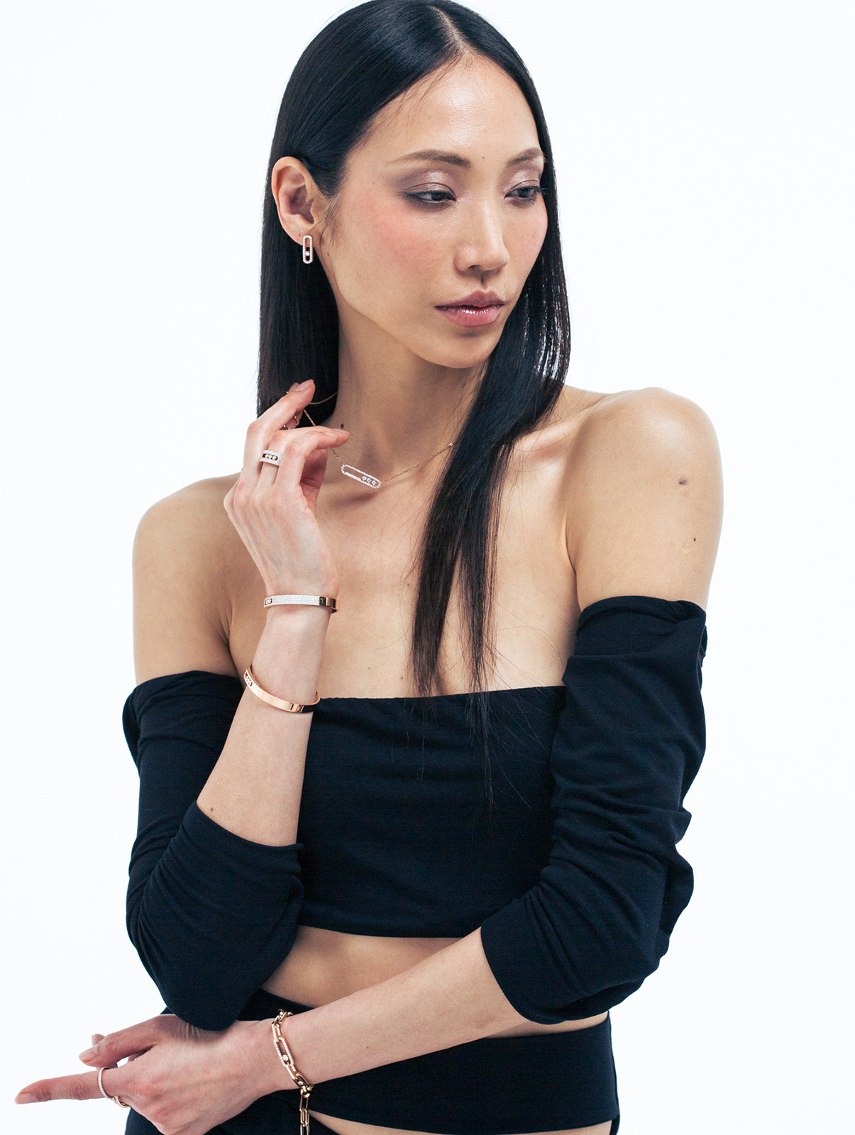 박수주: 뱅글 팔찌의 스타일과 본연의 강렬한 실루엣이 정말 마음에 듭니다. 강인하면서도 우아한 매력을 동시에 느낄 수 있거든요. 저는 젬스톤의 리듬과 움직임을 민감하게 받아들이는 편인데요. 무브는 가만히 멈춰 있는 주얼리가 아니라 생생하게 살아 숨 쉬며 춤을 춥니다. 손목에서 다이아몬드가 움직일 때마다 제 에너지와 앙상블을 이루는 독특한 멜로디가 펼쳐집니다.