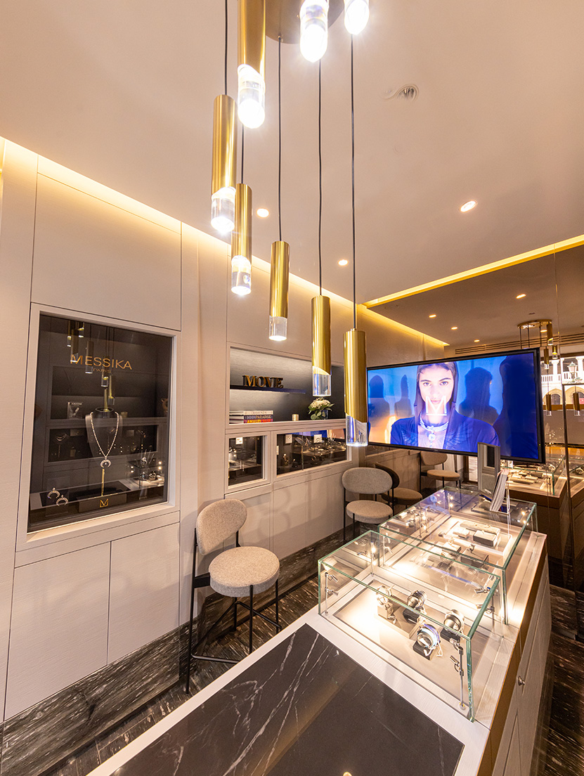 Новое пространство погружает посетителей в мир Дома. Уникальный искрящийся дизайн сочетает в себе золото и мрамор, что позволяет добиться абсолютного блеска драгоценных украшений с бриллиантами. Сочетание роскоши и современности, созданное Валери Мессикой, вызывает сильные эмоции с самого первого раза.