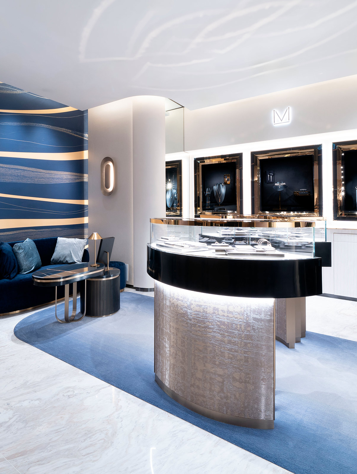 С помощью витрин, в которых представлены главные коллекции Messika, клиенты могут поближе познакомиться с уникальной эстетикой Дома и его прогрессивным стилем. Центральным элементом пространства является первый и уникальный для азиатского региона стенд Move. Это возможность открыть для себя самую знаковую коллекцию Дома. VIP-гости смогут насладиться радушным приемом в удобной зоне отдыха, декорированной различными деталями в стиле Дома. Среди таких элементов выполненные вручную обои, а также эксклюзивные ковры в оттенках синего, вдохновленные мотивом Move.
