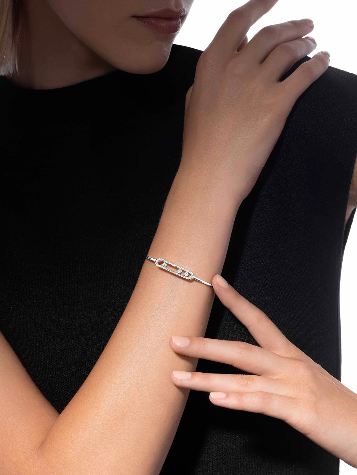 Если у вас тонкое запястье, наиболее гармонично будет смотреться изящный, не слишком массивный браслет-джонк, и наоборот. В зависимости от желаемого образа не бойтесь сочетать разные стили, мотивы, цвета и пропорции. Для еще более яркого эффекта носите одновременно на одном запястье браслет-джонк Move Uno Pavé из золота с бриллиантами и браслет-бэнгл Move Noa Full Pavé в виде ленты с выразительным графичным дизайном.
