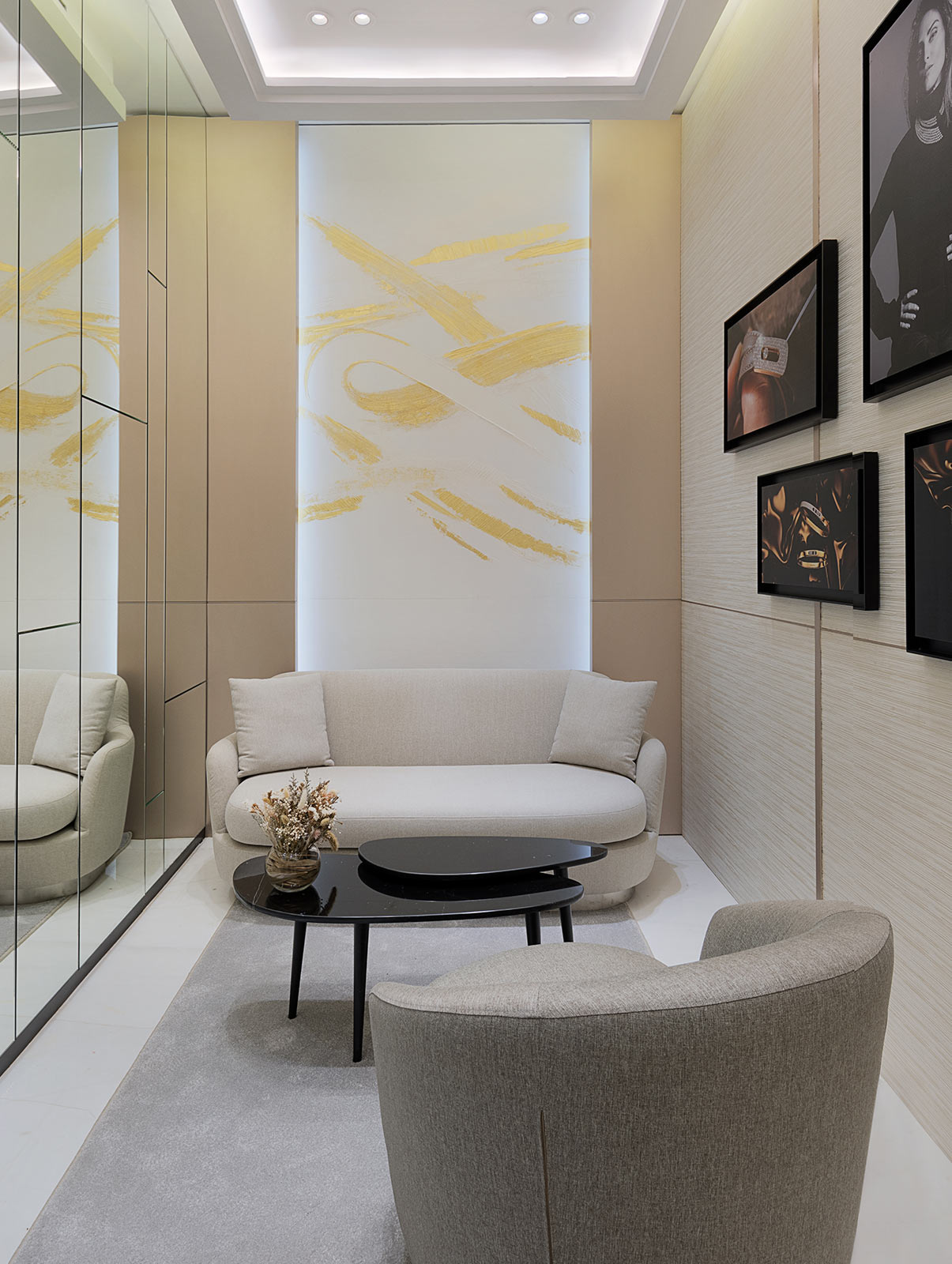 Дизайн этого бутика площадью 70 кв м., разработанного Валери Мессика, отражает ценности Дома, сочетая в себе роскошь и современность с творчеством, чистыми графическими линиями и минимализмом. Серые оттенки и металлические детали цвета розового шампанского, а также мрамор и граненые зеркала: благодаря уникальному сочетанию материалов посетители мгновенно окунаются в мир Messika.