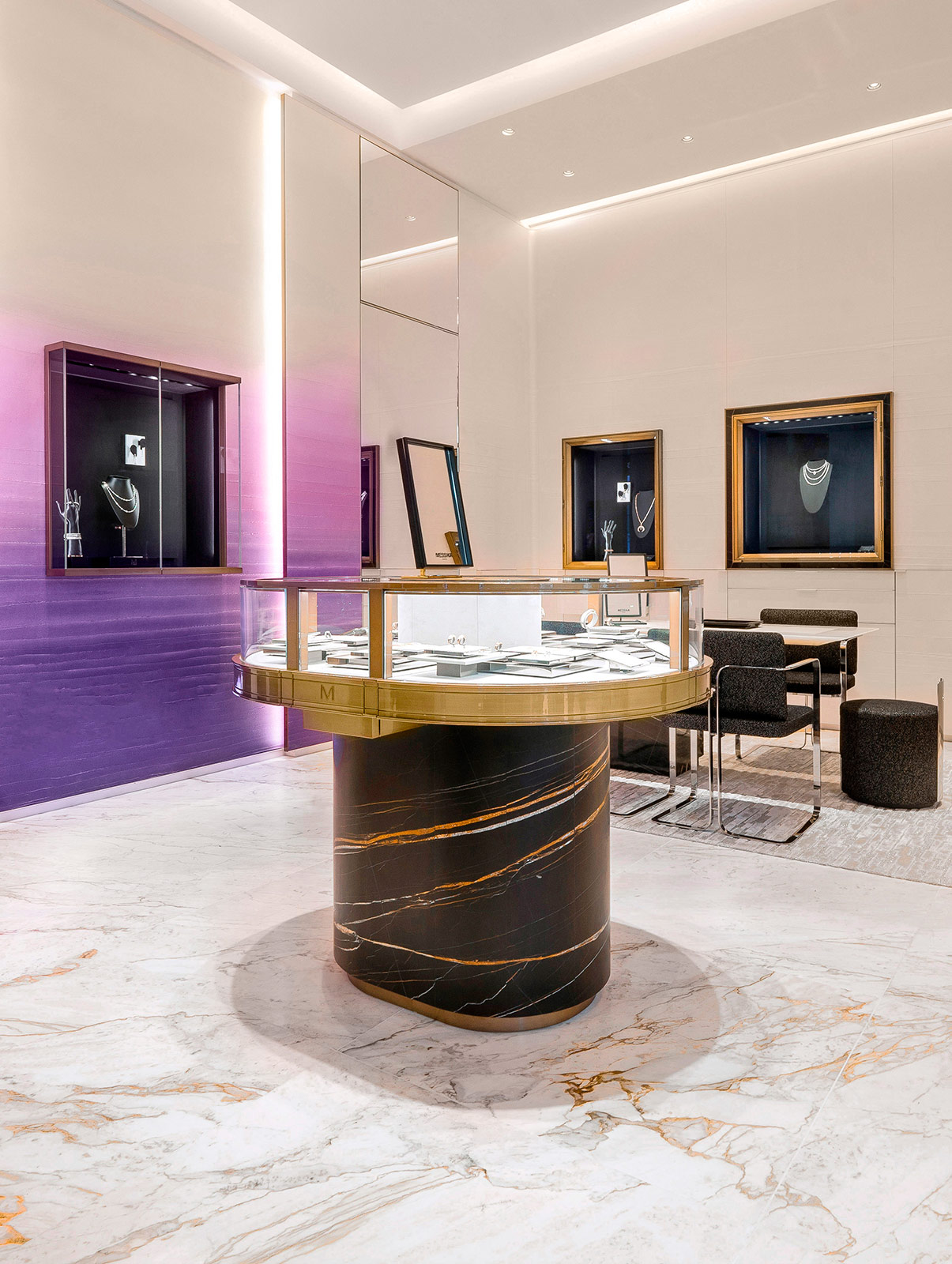 Обстановка отражает стиль Дома: блики золота, изысканный мрамор и белый оникс создают роскошный современный декор. Фактурные обои с изящным перламутровым эффектом, созданные по специальному заказу в мастерской художника Мартина Бержера, облачают стены в оттенки фиолетового. Атмосферу дополняет потрясающая люстра в виде прозрачных хрустальных волн с покрытием из золота. Этот элемент декора, напоминающий водопад, подчеркивает переливы бриллиантовых украшений Дома.